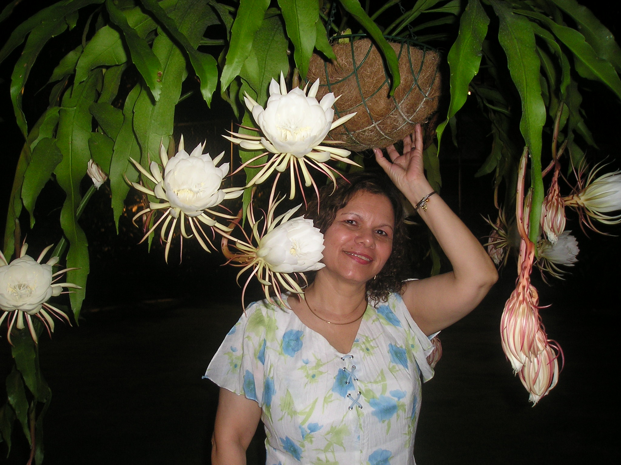 Lupe with our cactus. The white petals have the texture of fine feathers. The blooms open about 8 pm and close by 5 am the next morning. The blooms produce a penetrating sweet scent. The drooping blooms were from the day before. Over a period of three nights we had 17 blooms. Apparently in the Philippines there are no native